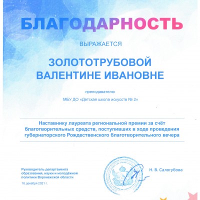 7 декабря 2021г. произошло важное событие, ставшее поистине знаковым в творческой жизни нашей школы. Речь идёт о присвоении почётного звания «Лауреата региональной премии за счёт благотворительных средств, поступивших в ходе проведения губернаторского Рождественского благотворительного вечера» в рамках Форума одарённых детей Воронежской области учащейся 4 класса отделения народных инструментов (специализация «домра») Елизавете Чуприковой. Класс заслуженного работника культуры РФ Валентины Ивановны Золототрубовой.